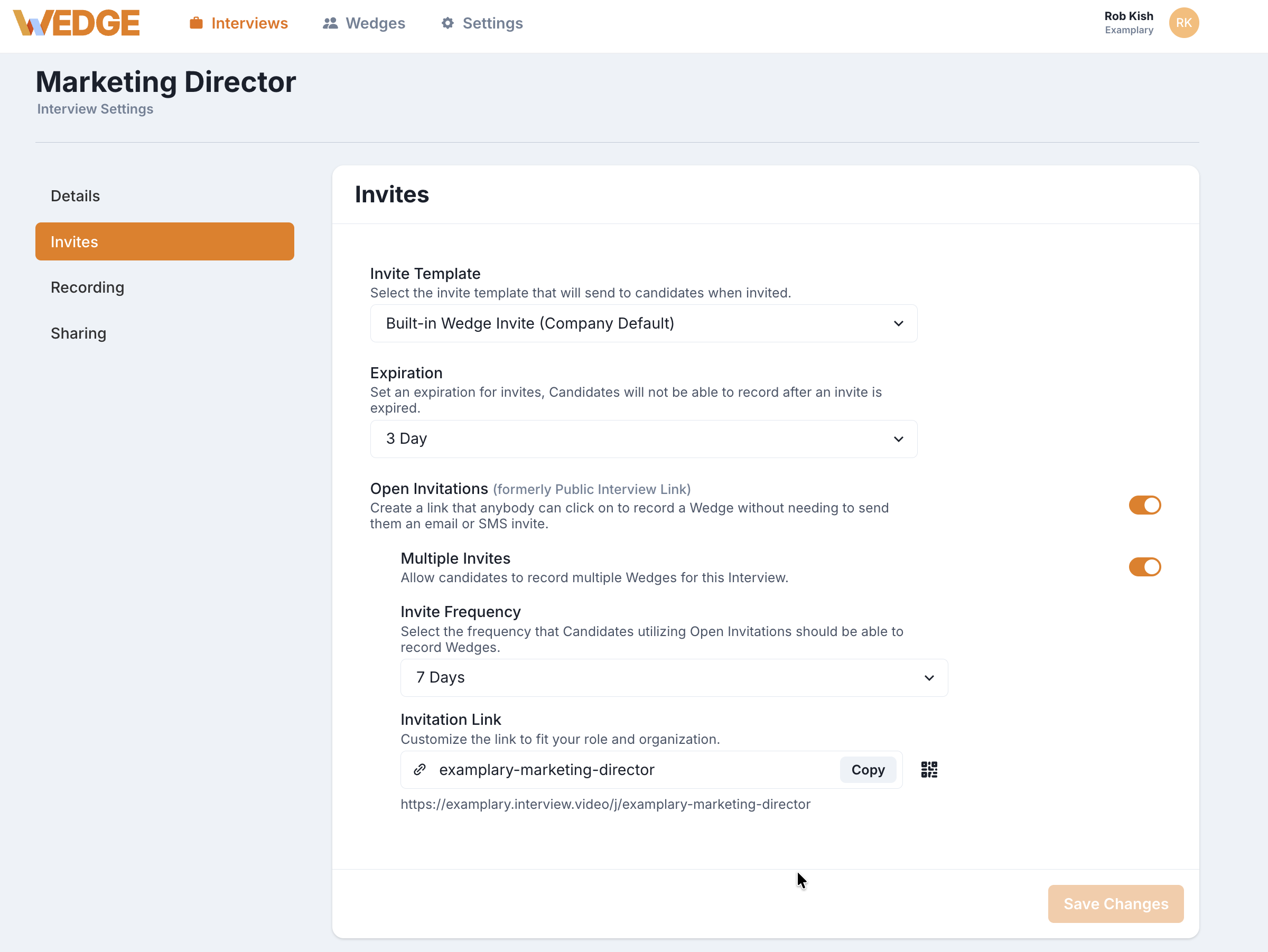 Open Invitations let you create a shareable link for your interview. Anyone with the link can record a WedgeHR video interview on their own time, without you needing to send individual email or SMS invites.